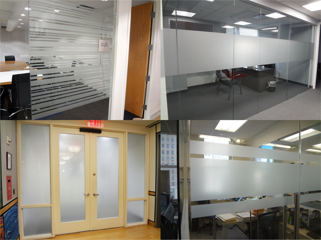 Our window frosting applications are perfect for privacy banding and distraction marking in office and corporate environments as well as retail and storefront. We can fully frost your glass panels, or frost certain areas while leaving other areas clear. The frosted films we utilize are high quality brands including 3M Dusted Crystal, 3M Frosted Crystal, and Avery Etchmark Vinyl. | |