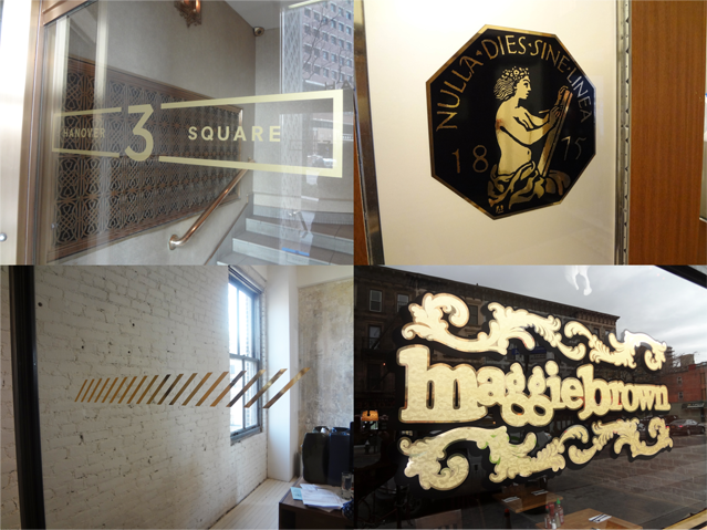 Signs Visual is the choice for your gold leaf vinyl projects. We stock a variety of gold vinyl films including florentine gold leaf, hammered gold leaf, mirror-gold, satin gold, and standard gold. This type of application is very popular in luxury corporate settings and high-end retail. These type of vinyl graphics can be layered for a more antique effect. | |
